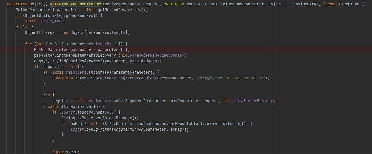 在接口收到请求之后,我们很容易就可以定位到这个方法,进入这个方法中,发现有getMethodArgumentValues这个方法的调用。