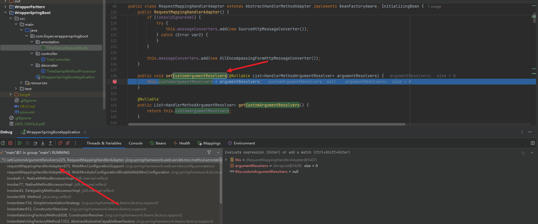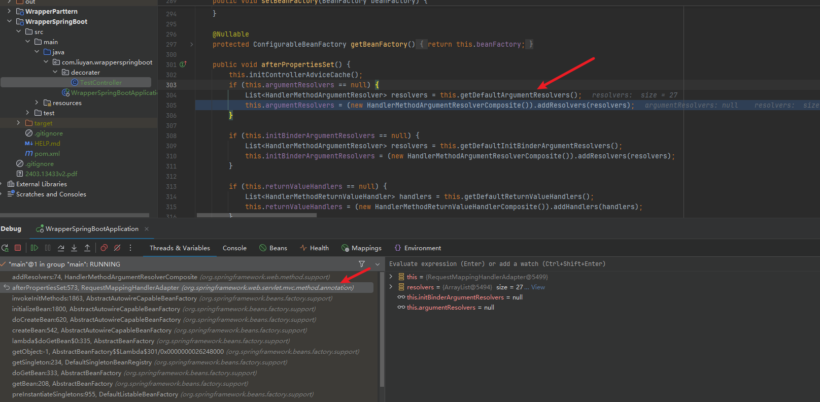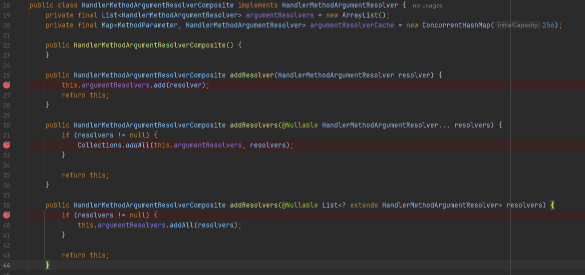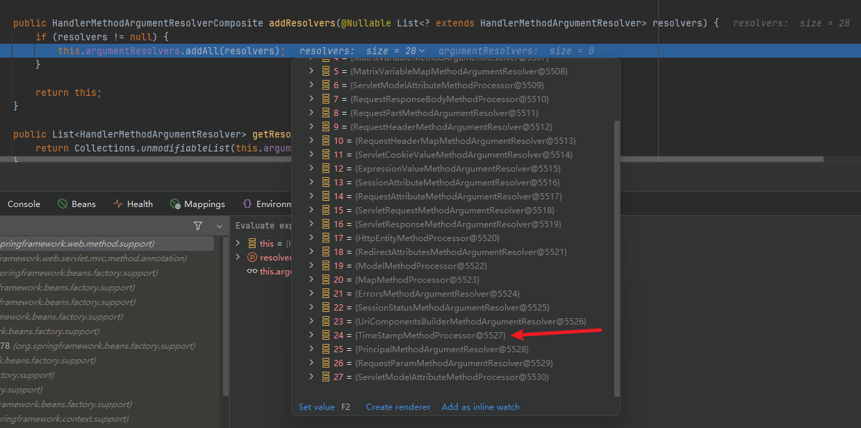 同时如果不加配置的情况下,resolvers的size应该是27个(这里就不截图了)。因此可以确定,我们如果想实现目标,需要添加一个自定义的resolver或者是对某一个resolver进行增强,也就符合装饰器模式的定义,也就需要再看看Spring是什么时候添加这些resolver的,点进去这个HandlerMethodArgumentResolverComposite给这几个addResolver()打上断点,再看看调用堆栈。