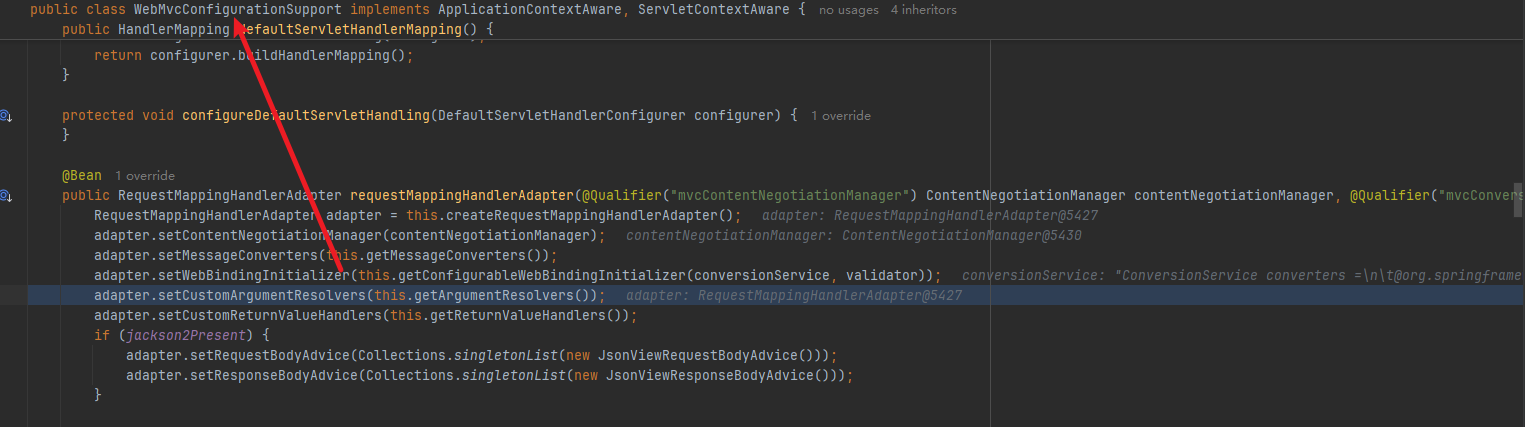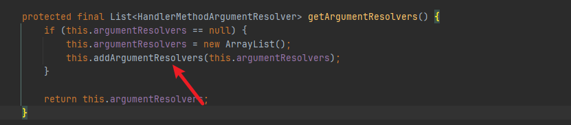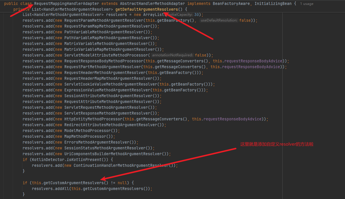 很容易定位到下边这些个箭头的方法~,这个getDefaultArgumentResolvers是一坨巨大的石山(一个个new出来然后再add)。