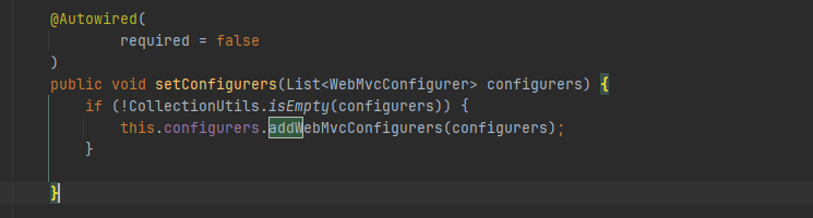 这里就是添加argumentResolver的地方,还是一个经典的懒加载,那么再进入一下这里的方法调用,发现这是一个接口,那么找找实现类,其中只有一个DelegatingWebMvcConfiguration,仔细观察一下这个类的代码,又是一个经典的装饰器实现,那我们势必要再看看他装饰的类(WebMvcConfigurerComposite)中addArgumentResolver的实现了,可以找到一个addWebMvcConfigurers的方法被调用,就需要看看DelegatingWebMvcConfiguration是怎么调用这个方法的了。