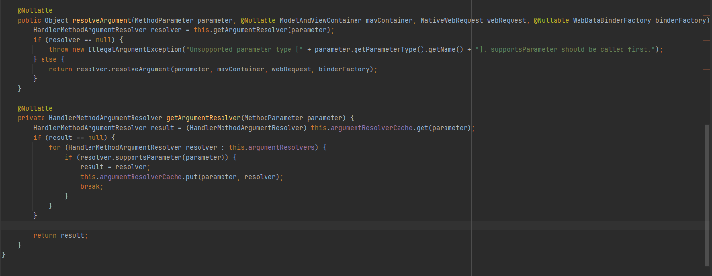 接着再回来,这里的HandlerMethodArgumentResolverComposite也是一种装饰器模式的实现,即它本身是一个...resolver,里边又塞了一个resolver的list,在实际执行resolve方法的时候,他先获取支持当前param的resolver再丢给对应的resolver进行处理。